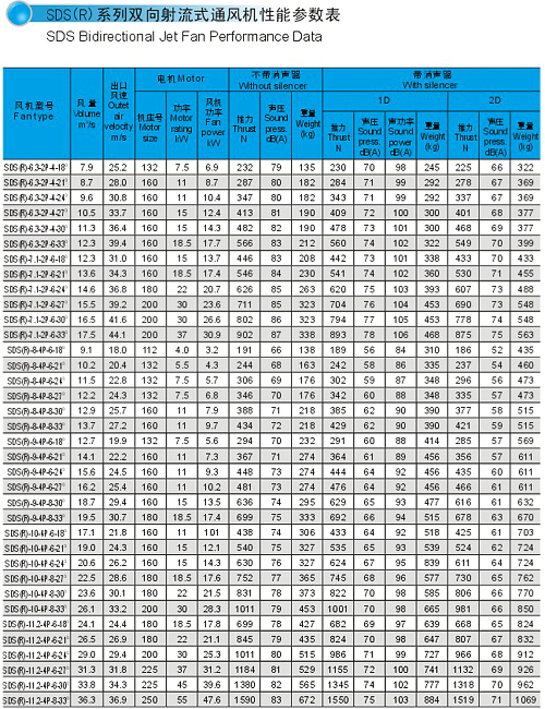 SDS系列射流風機規格自Φ630㎜~Φ1600㎜,分單向運轉軸流風機和可逆式(雙向)運轉軸流風機二大類,最大推力達到3500N,對于絕大部分負荷和工況均可選擇此類高效、低噪聲風機。